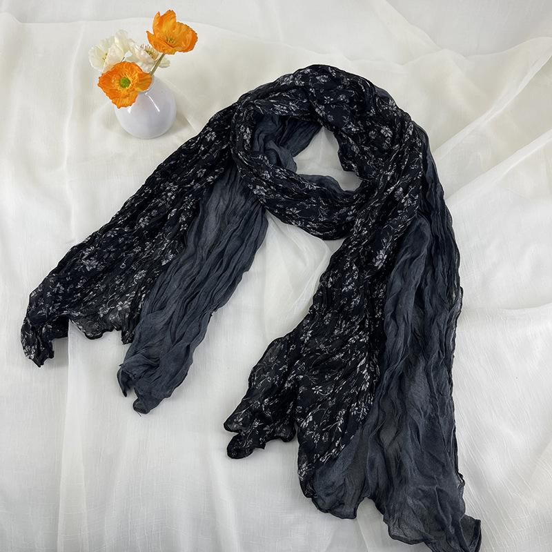 Ethnic Style Pleated Floral Long Scarf Women Korean Retro Thin Shawl Fashionable Temperament Color Blocked Silk