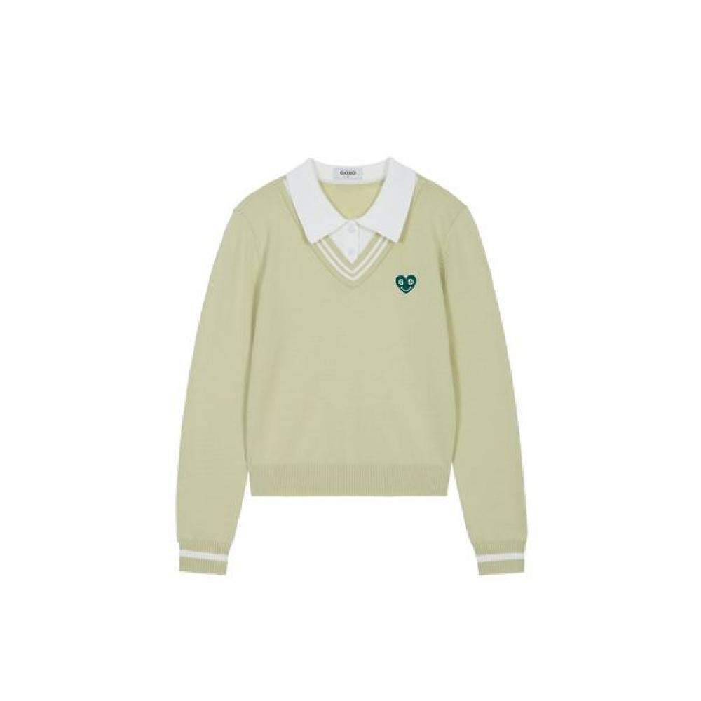 The Smile Heart V Neck Color-Block Knit is a V-neck top made with a knit structure that extends to the collar. The V-neckline features a color-block stripe detail that adds a natural design point. Made of soft knit material, it can be worn comfortably without an inner, making it suitable for both rounds and daily styling.