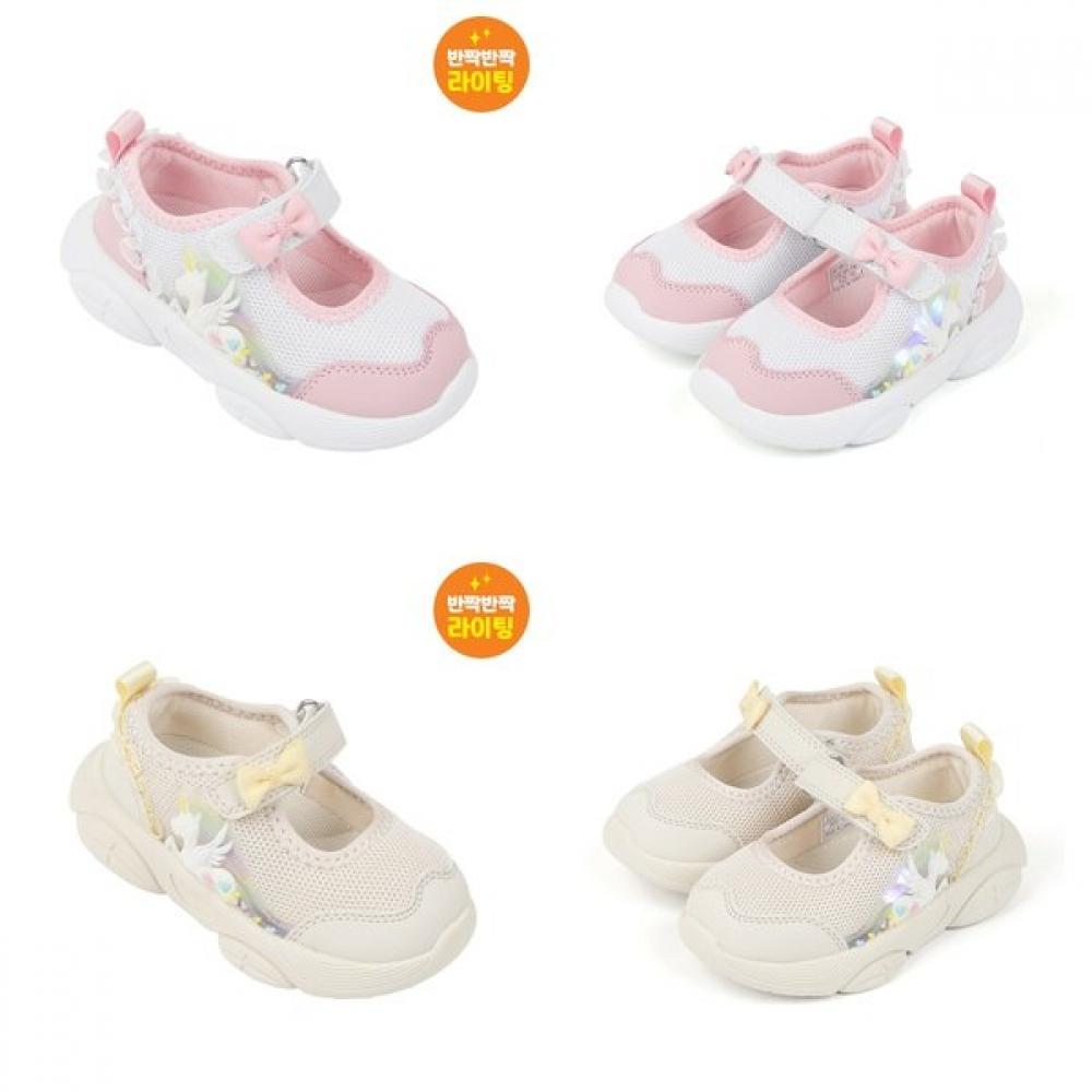 The DINOSOLES Unicorn Sherry Toddler is a unique athletic shoe equipped with sparkling LED lights. It features a mesh upper and a blown outsole, offering excellent breathability and comfort. The Mary Jane strap and Velcro make it easy to wear, while the LED light mechanism in the unicorn figure stands out.