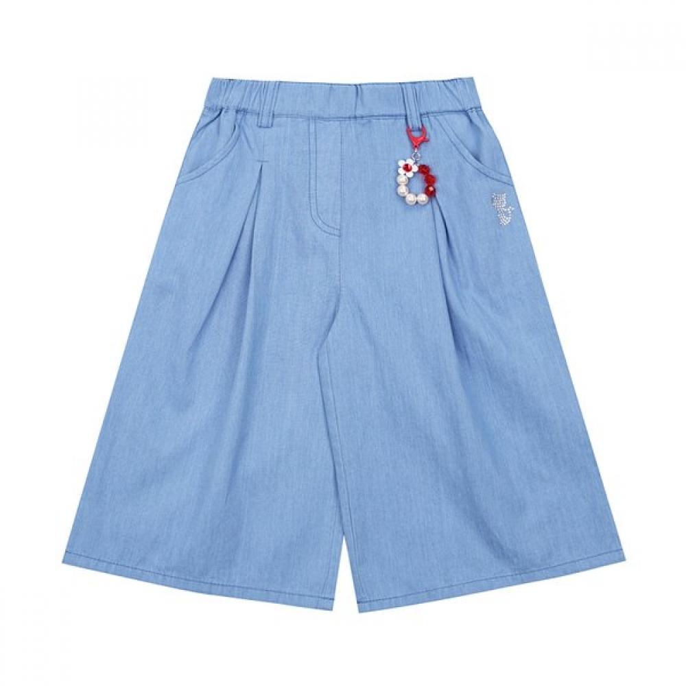 The Denim Wide Pants Q52DAP040N4 are made from distressed denim material with a 7-8 length. They feature a wide style with pleats, and the overall band design provides comfortable fitting. A cute beaded keyring adds a stylish point.