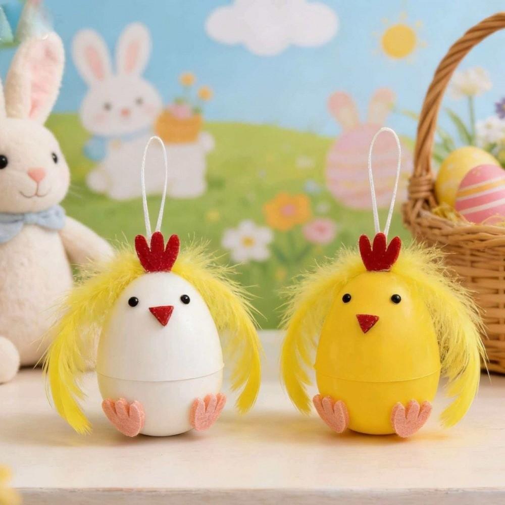 The overall design is soft, cute, and lively, full of childlike charm. of the Easter egg is made of hard plastic material, which is smooth, wear-resistant, Feather and velvet accessories are made of highly realistic materials, which have a and are not easily ; The top comes with a hanging rope, which is sturdy in workmanship and combines aesthetics and durability.