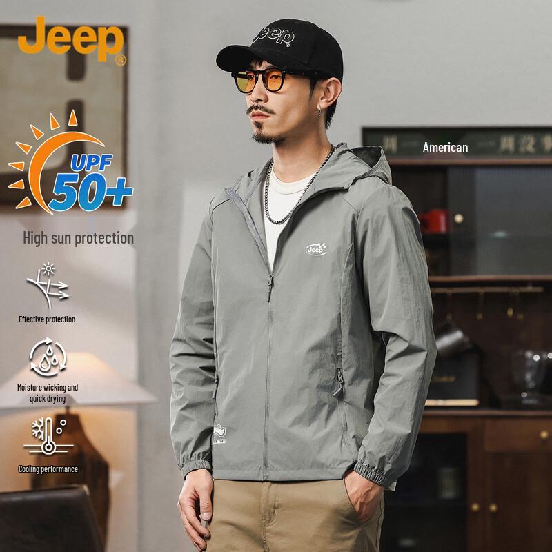 Stay protected and stylish during spring and summer with this JEEP Men's Lightweight Hooded Sun Protection Jacket. Crafted from 100% Nylon, it offers excellent UV protection with UPF50+ and UVA transmittance less than 5%, making it ideal for outdoor activities. Its versatile, casual design with a hooded collar and zip closure ensures comfort and a trendy look.