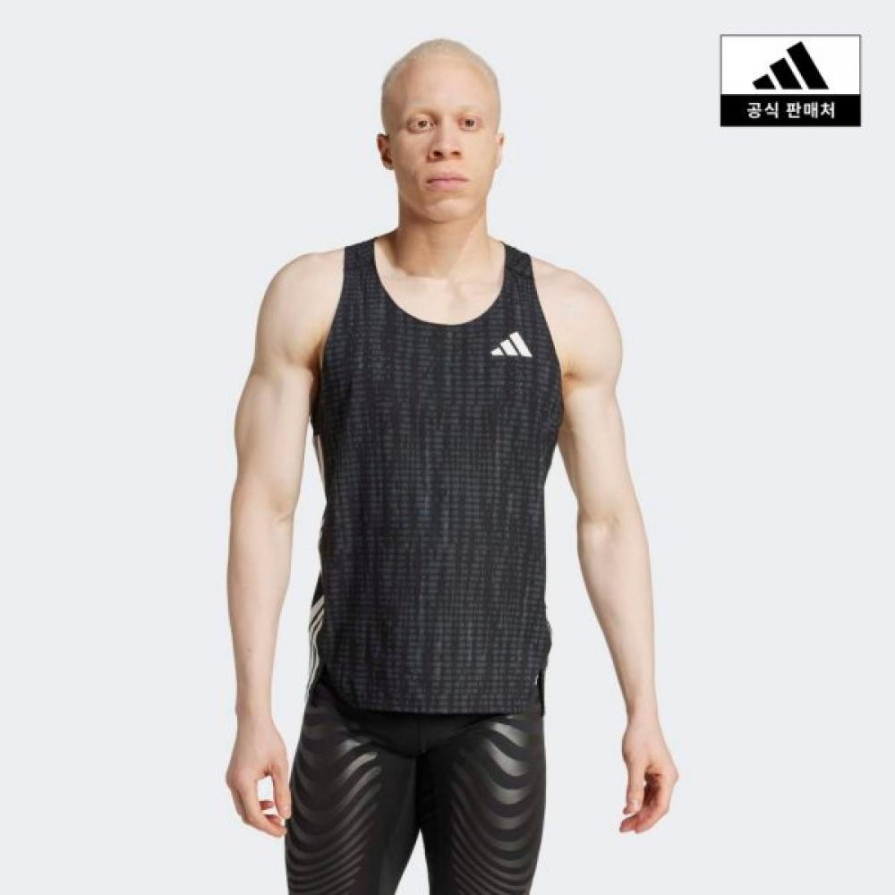 The Adidas Adizero Running Singlet JN0298 is a men's running singlet featuring lightweight comfort and breathability. The product is designed with a sleek slim fit, and the side seam is angled forward, covering wear areas with tape to reduce friction against the skin. Additionally, it features moisture-wicking properties, absorbing sweat quickly to support a comfortable run.
