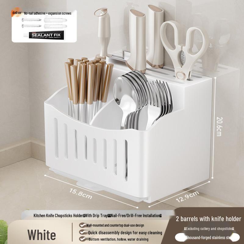 White Drill-Free Wall-Mounted Kitchen Organizer with Double Knife & Chopstick Holders