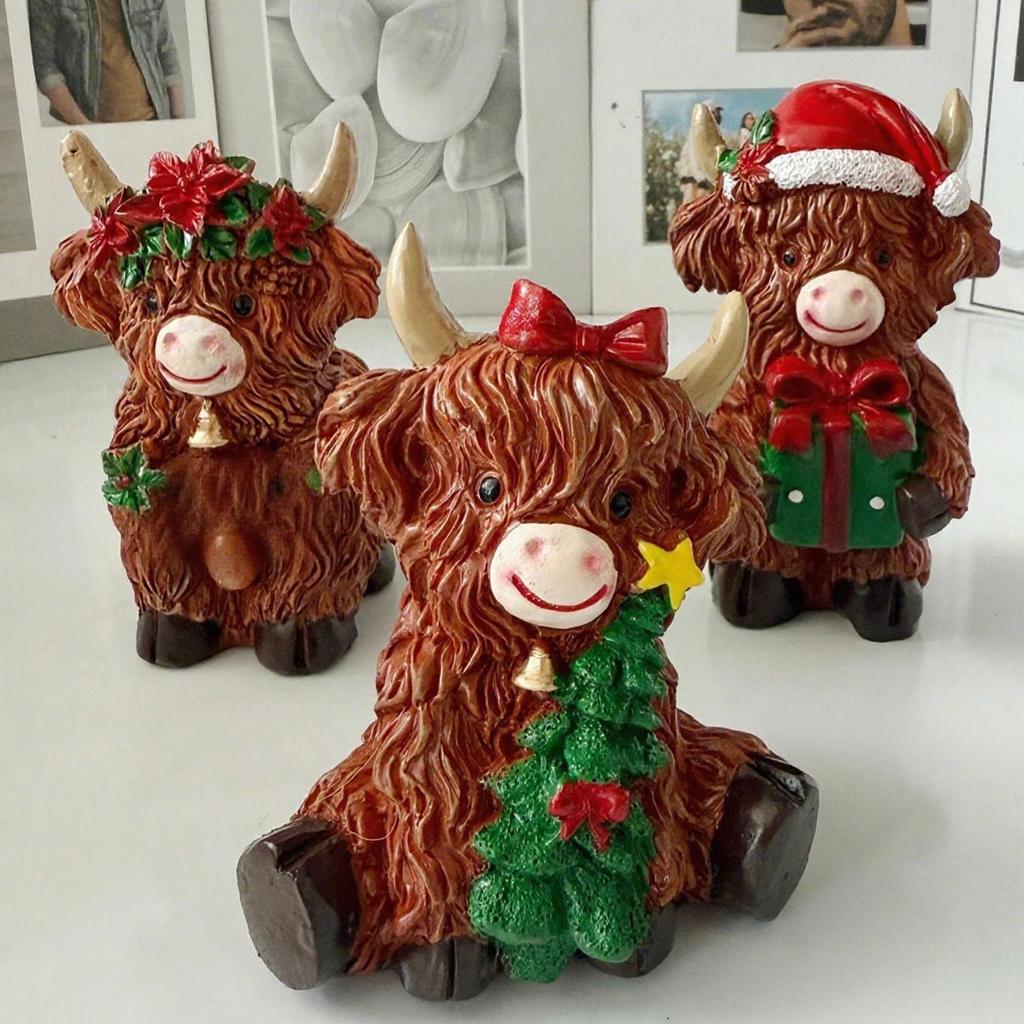 3pcs Christmas Highland Cattle Statues Cute Highland Cow Resin Sculpture Decorations Accessories Christmas Gifts