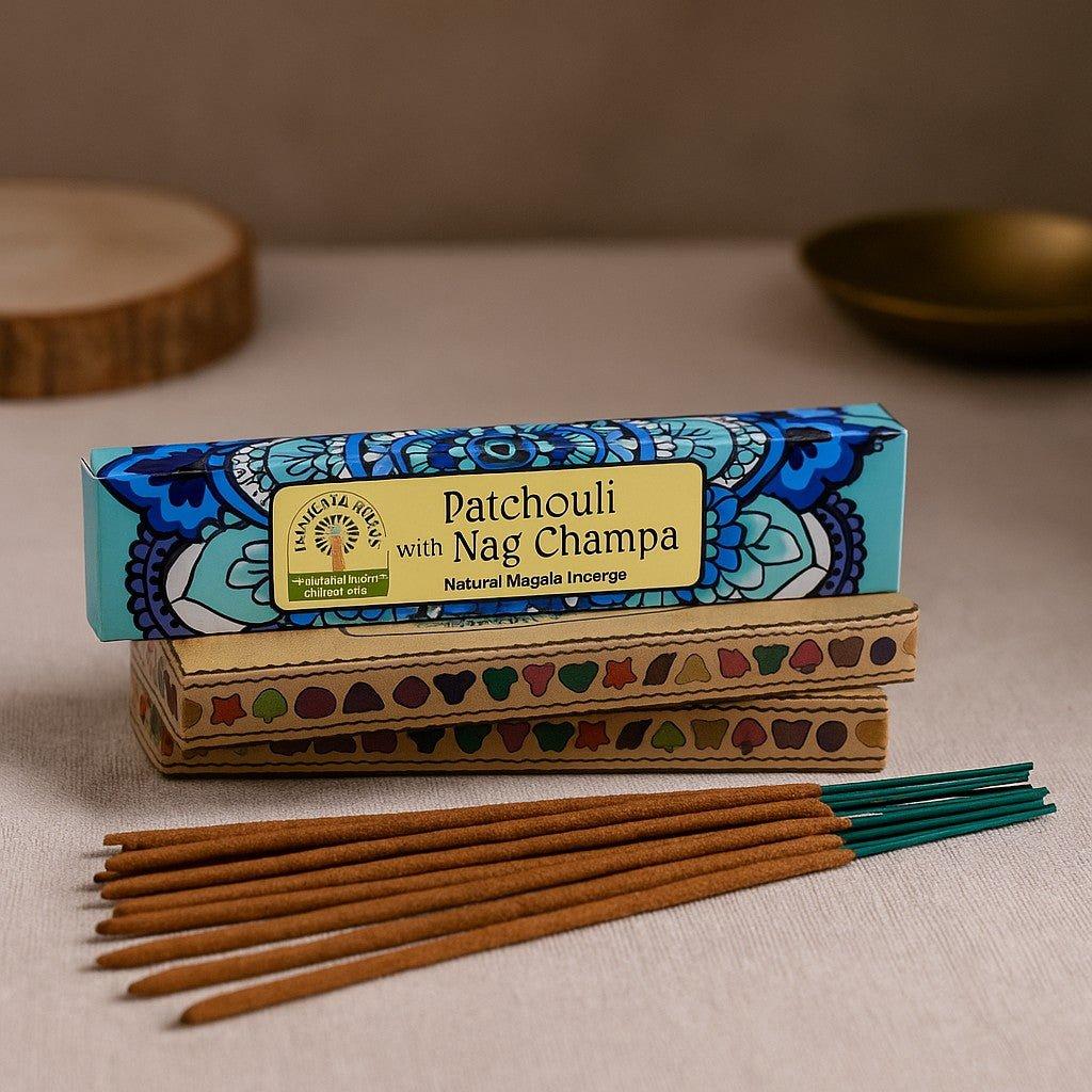 Patchouli grounds the blend with deep, mossy earth and a faint spice. Nag champa—known for its classic Indian pairing of velvety florals, gentle woods, and soft resin—adds creamy warmth and a subtly sweet halo. The result is rounded, soothing, and lingering without heaviness.