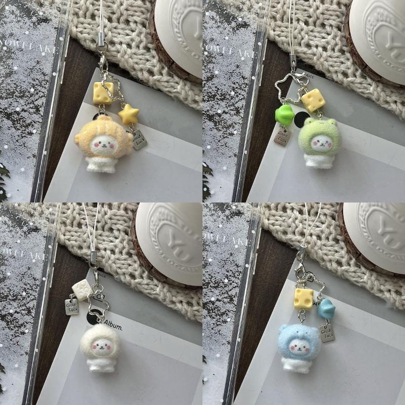 Cute Cartoon Flocking Little Bear Keychain Kawaii Pesin Mobile Phone Rope Pendant Backpack Decoration Pendant Accessories Gift