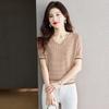 Women's Knitted T-shirt Short Sleeved V-neck Ice Silk T-shirt Color Blocked Loose Top