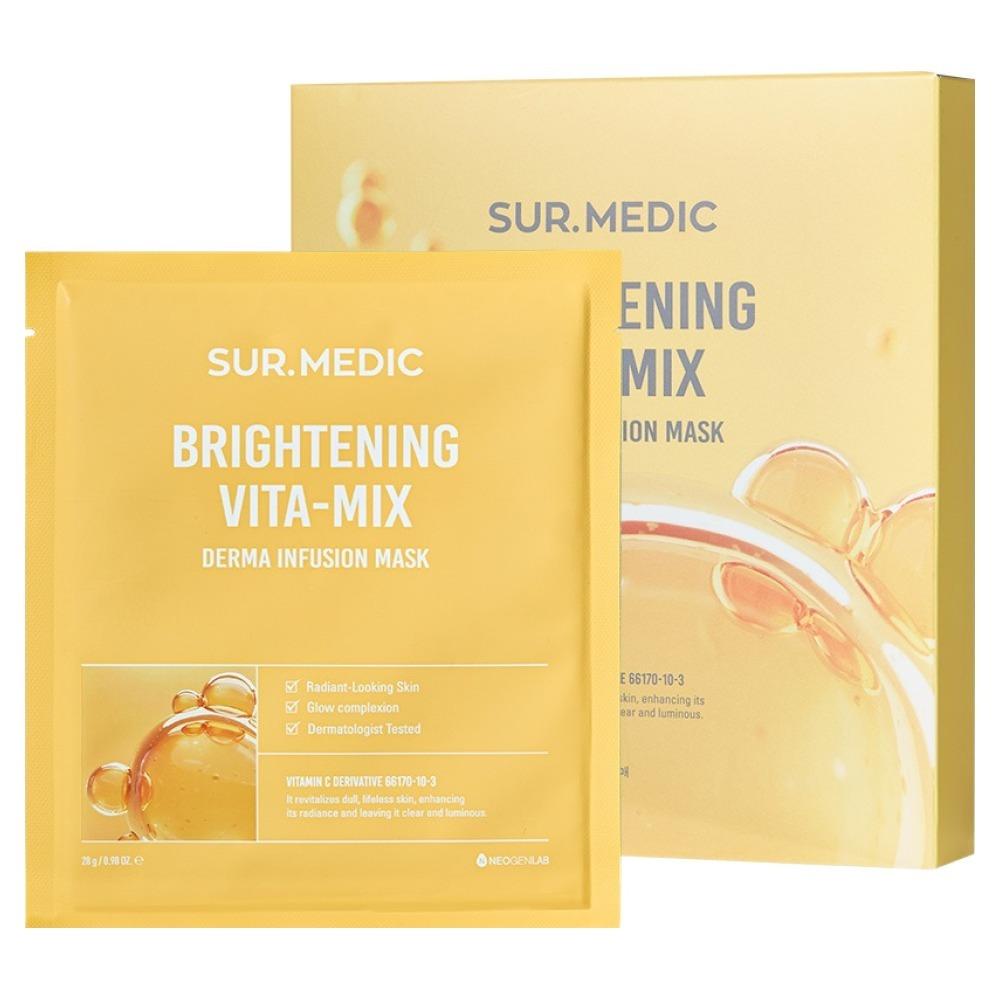 The Sur.Medic+ Derma Infusion Mask Brightening Vita-Mix is a high-performance sheet mask designed to instantly revitalize dull and tired skin. Infused with a potent "Vita-Mix" complex including Vitamin C and Niacinamide, it targets hyperpigmentation and uneven skin tone for a clearer, more luminous complexion. The ultra-fine microfiber sheet adheres perfectly to the face, ensuring the deep infusion of active brightening ingredients for a professional derm-care result at home.