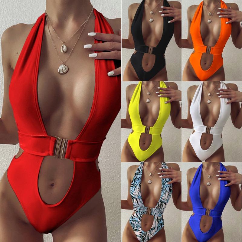 ביקיני חדש בצבע אחיד שלם V עמוק סקסי עיצוב אבזם מכירה חמה