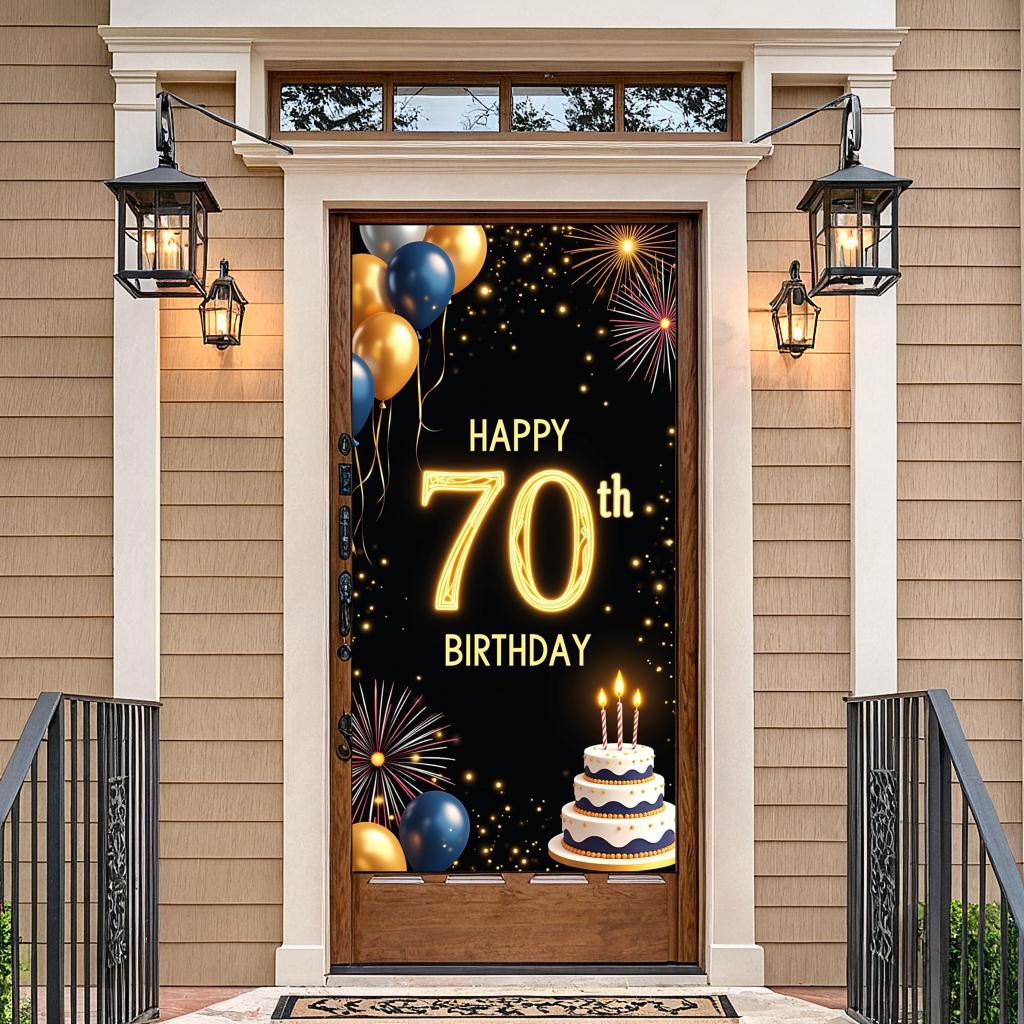 Happy 70th Birthday Banner Backdrop Black gold Birthday Party Decorations Photography Props Sparkle Balloon Background