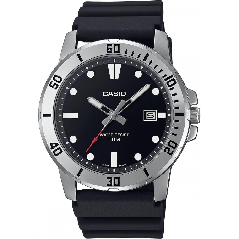 The CASIO Standard Analog Quartz Men's Watch MTP-VD01-1EV Military Black is a timepiece that combines style and functionality. With 5 ATM water resistance, it protects against moisture in daily life, and its mineral glass is resistant to scratches, providing excellent durability. The watch includes a date display function and boasts an average monthly accuracy of ±20 seconds, adding to its practicality. It also features a battery life of approximately three years for continuous use.