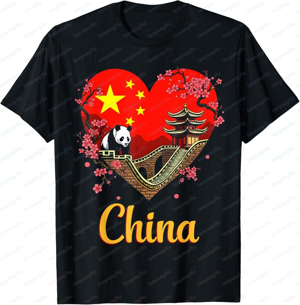 China Flag Panda The Great Wall Love Heart TShirt Unisex Summer Streetwear Tops Cotton Mens Clothing Graphic Short Sleeve Tee