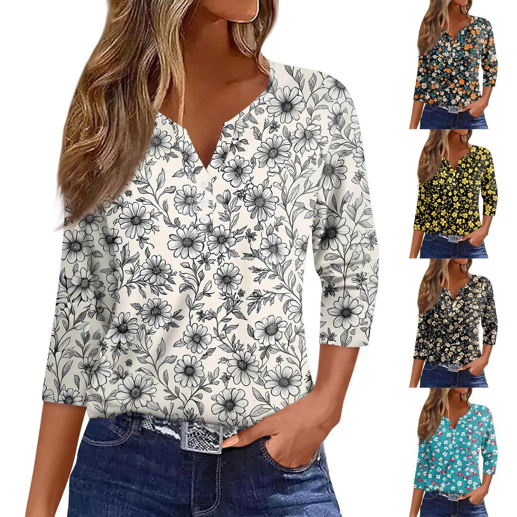 Women's T Shirt Print Button 3/4 Sleeve Daily Weekend Fashion Basic V- Neck Regular Top