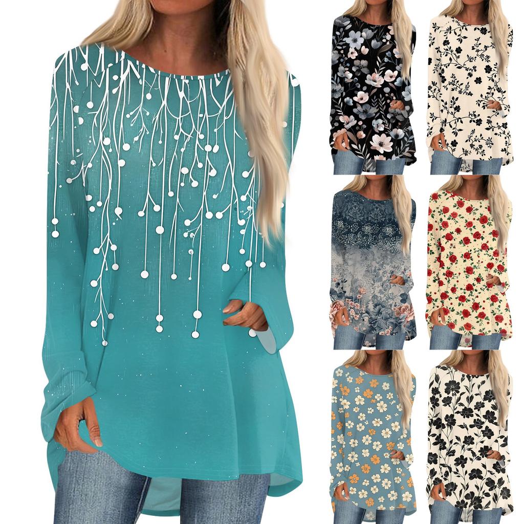 Women's Fashion Casual Long Sleeve Print Round Neck Pullover Top Blouse