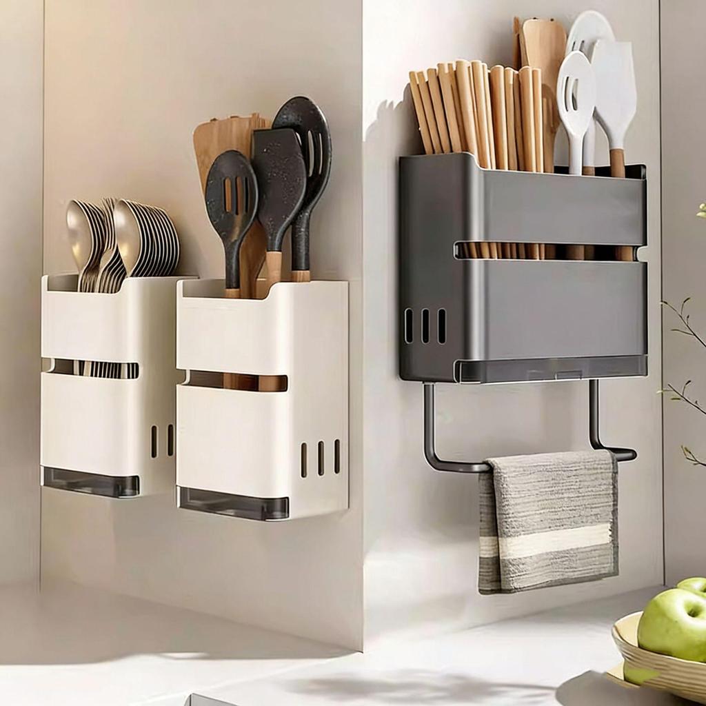 Wall-Mounted Kitchen Chopsticks & Utensil Holder with Draining Basket and Rag Rack