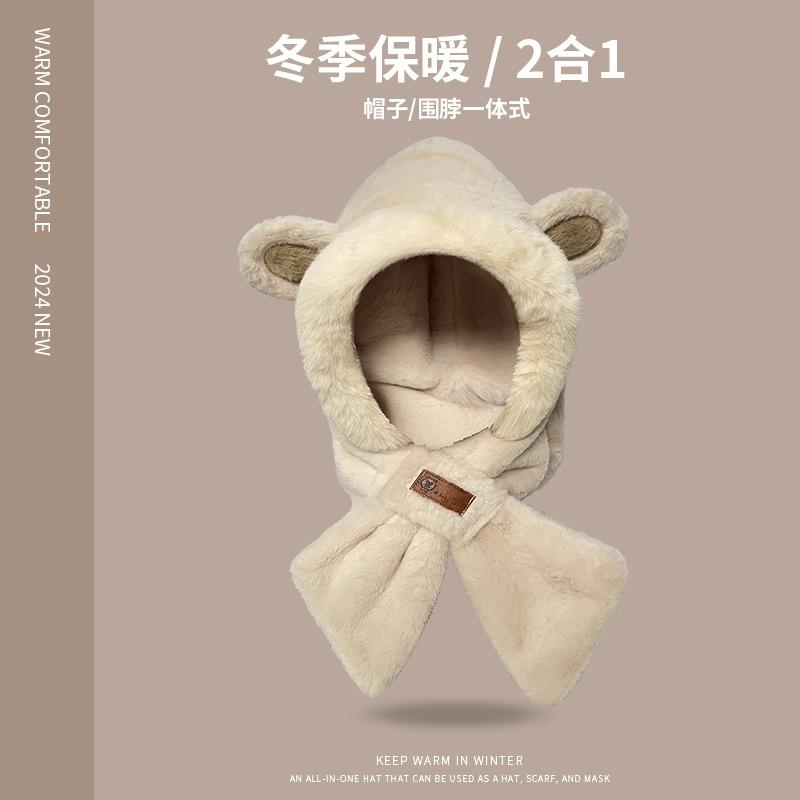 Winter bear ear-protecting hat and scarf combo for women, autumn and winter versatile cute hooded plush warm Korean style trendy