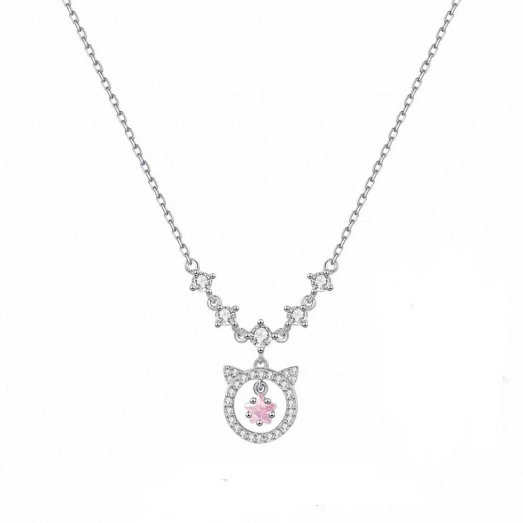 Pink Star Cat Necklace for Women: Nickel Silver with Gold Plating and Diamond Inlaid Pendant, Sweet Style High-Value Jewelry