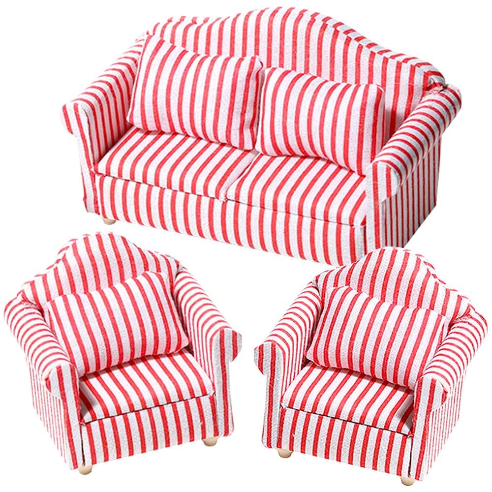 Moin Moin Miniature Furniture Sofa Set 1/12 Scale 3 Pieces White Red Striped Fabric Dollhouse