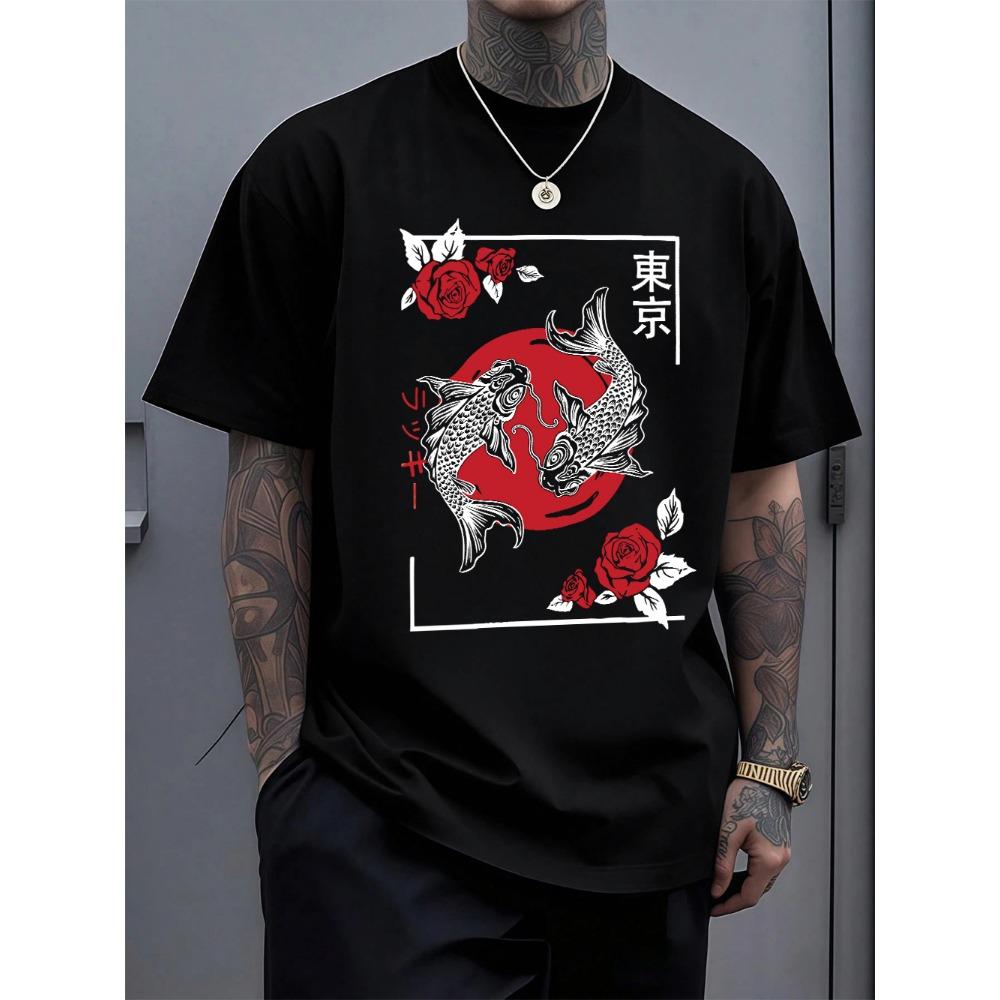 Tokyo Harajuku Koi Fish Printed Mens T-Shirt Cotton Summer Short Sleeve Tops Soft Oversized O-Neck T Shirt Clothes