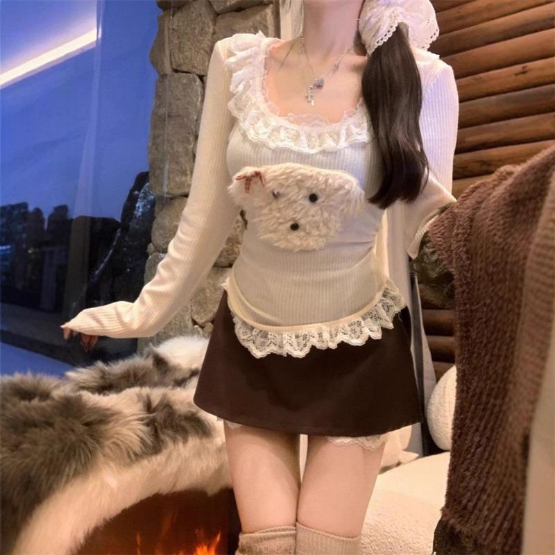 Lace Knitted T-shirt for Women in Autumn and Winter New Style Bottoming Shirt with Short Top
