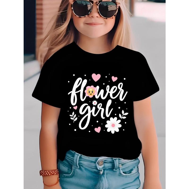 European Size Girls Short Sleeved T Shirt with Pure Floral and Heart Shaped English Pattern Comfortable and Breathable