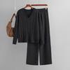 סט סוודרים מוצק קז'ואל סרוג משוחרר לנשים עם צווארון V מעוות סריג עליון גבוה מותן ישר מכנסיים רחבי רגליים סט 2 יחידות רך סט סריג לעבודה פשוטה