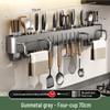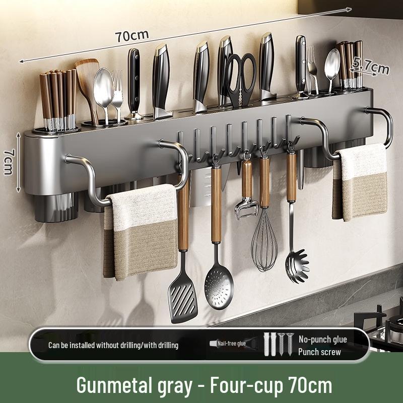 A multi-functional, punch-free kitchen storage rack designed for organizing knives and utensils. This durable, adhesive wall-mounted solution helps maximize counter space with its integrated knife holder and cups.