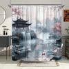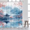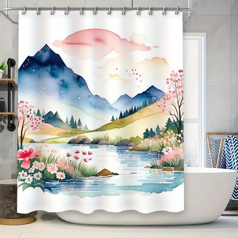 Watercolor Scene Shower Curtain Nature Landscape with Mountains and Flowers Pink Clouds Above Waterfall Decorative Fabric Liner