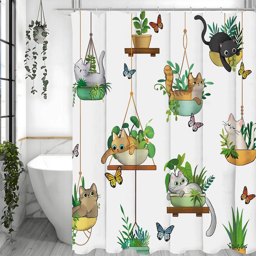 Cat Shower Curtain, Hanging Potted Kitten Plant Stand Bathroom Decorative Shower Curtain, Waterproof Shower Curtain with Hooks