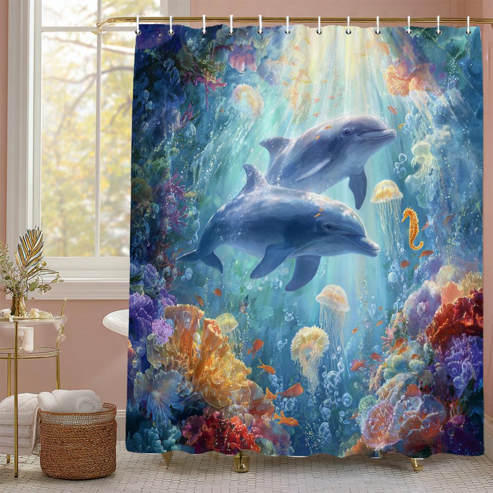 Underwater World Ocean Dolphin Jellyfish Shower Curtain, Bathroom Decorative Shower Curtain, Waterproof Shower Curtain with Hook