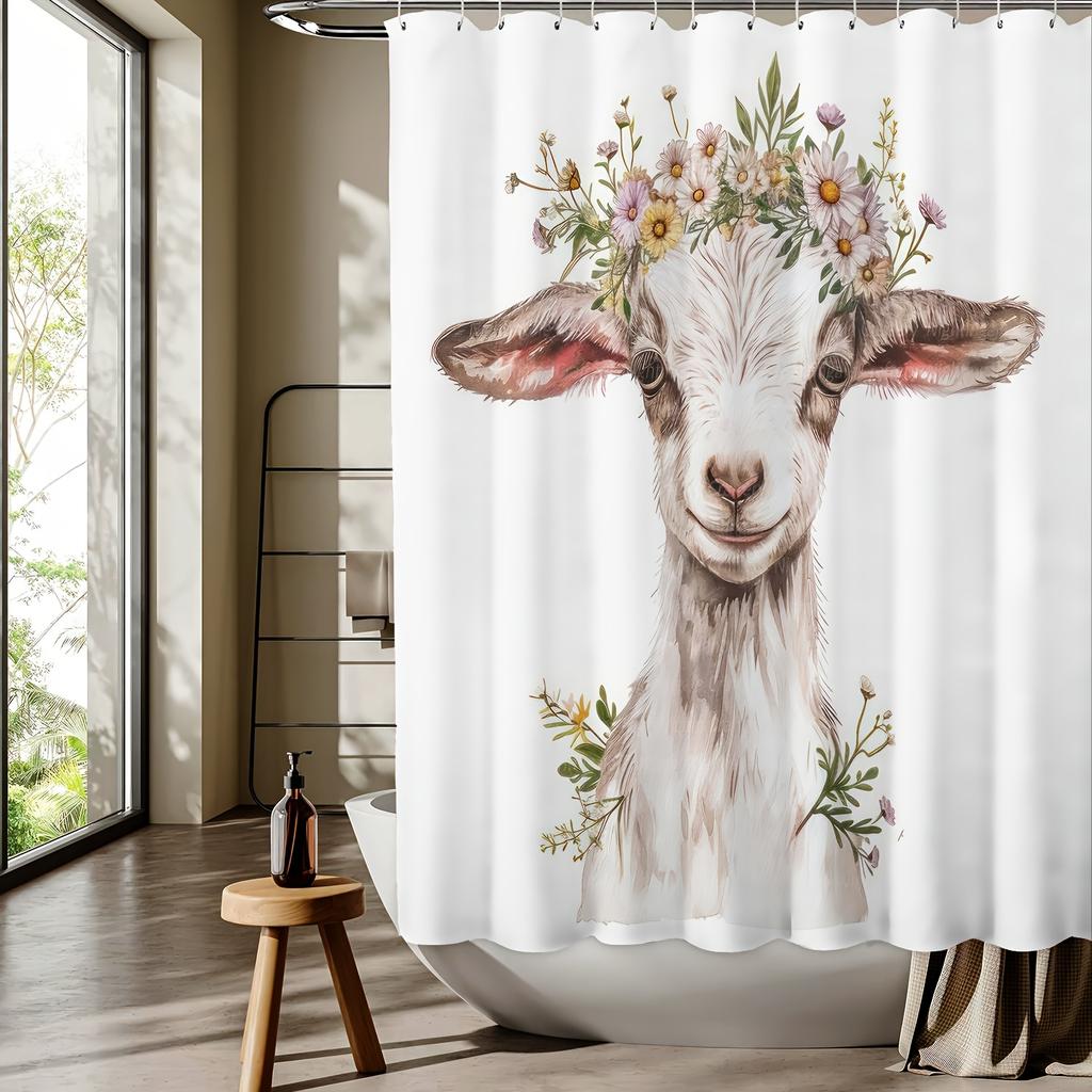 Floral Lamb Digital Print Shower Curtain – Reversible Polyester with Hooks, Machine Washable for All-Season Bathroom Decor
