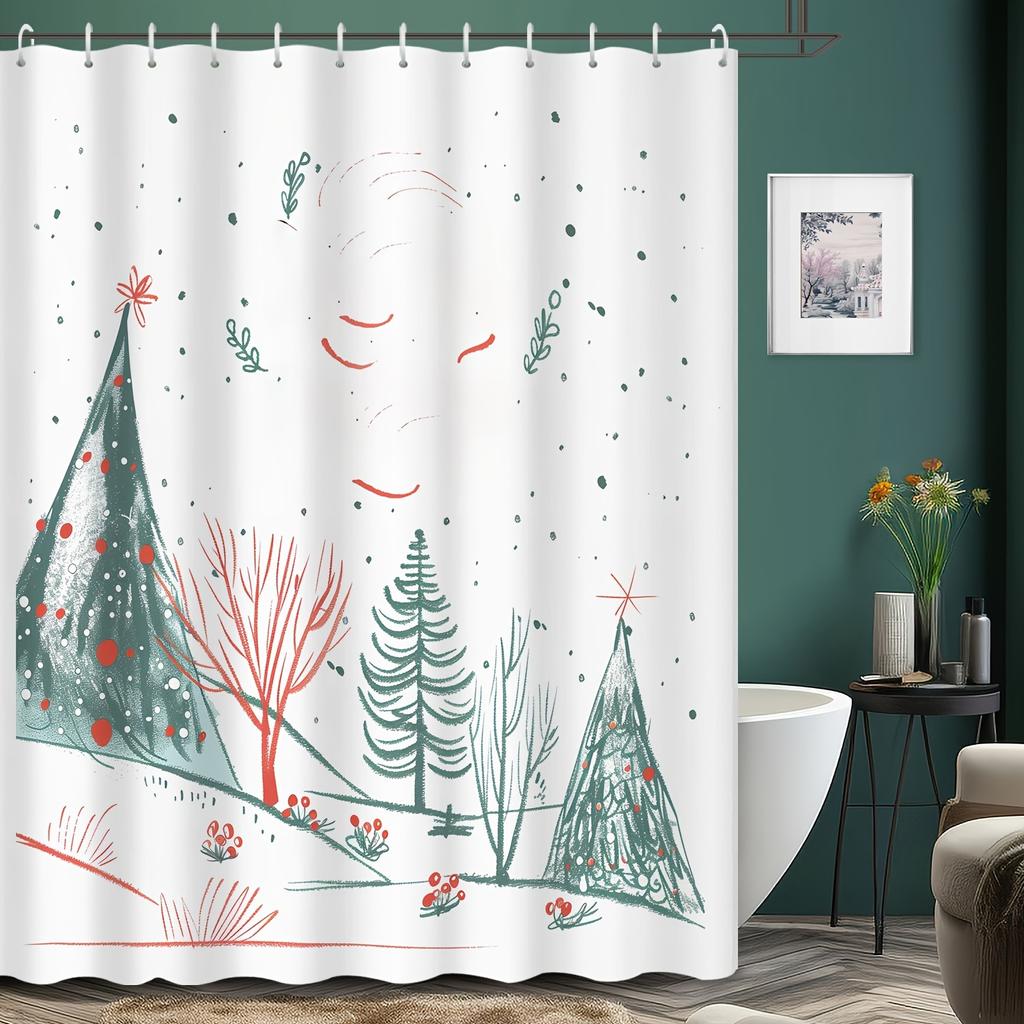 Christmas Cartoon Winter Forest Shower Curtain - Green Tree Illustration, 12 Hooks, Bathroom Decor