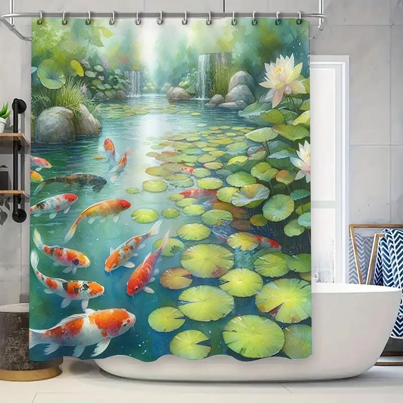 Vibrant Fishes Shower Curtain with Lotus Pond Scene Waterproof Fabric for Bathroom Decorations Multi-Colored Koi Carps Design Si