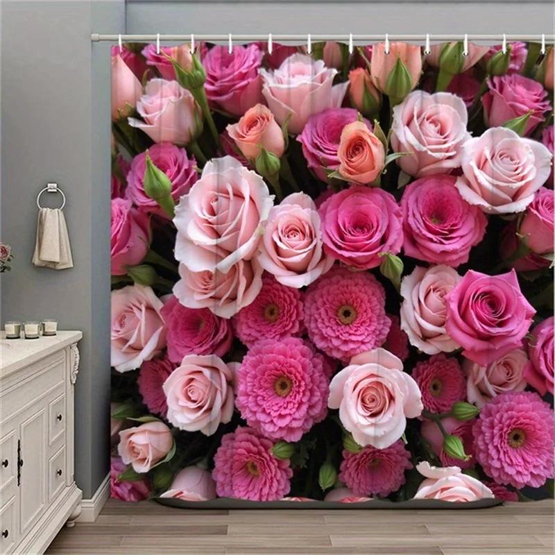 ~O~1pc Pink Rose & Carnation Shower Curtain - Green Leaves, Polyester, 12 Hooks, Detailed Floral Design, Elegant Bathroom Decor