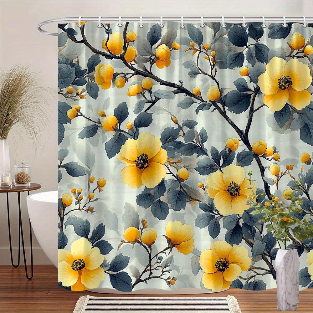 1 yellow floral shower curtain with dark teal leaves, soft grey background, polyester fabric with hooks, machine washable