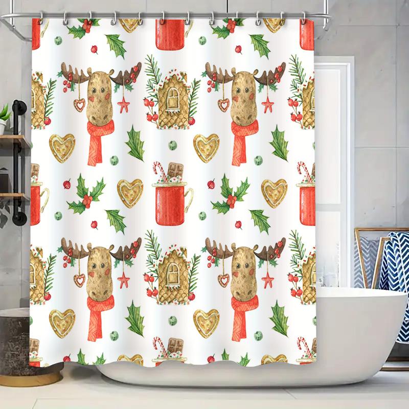 X-Mas Decor Shower Curtain with Elk Pattern Festive Red Green Christmas Print Home Decoration Waterproof Bath Curtains for Bathr