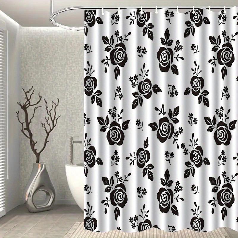 1pc Black and white rose patterned shower curtain, polyester fabric, machine washable, with hooks, suitable for bathroom décor.