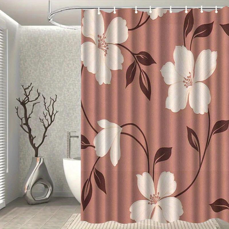 1pc White floral patterned shower curtain, polyester fabric, machine washable, with hooks, suitable for bathroom décor.
