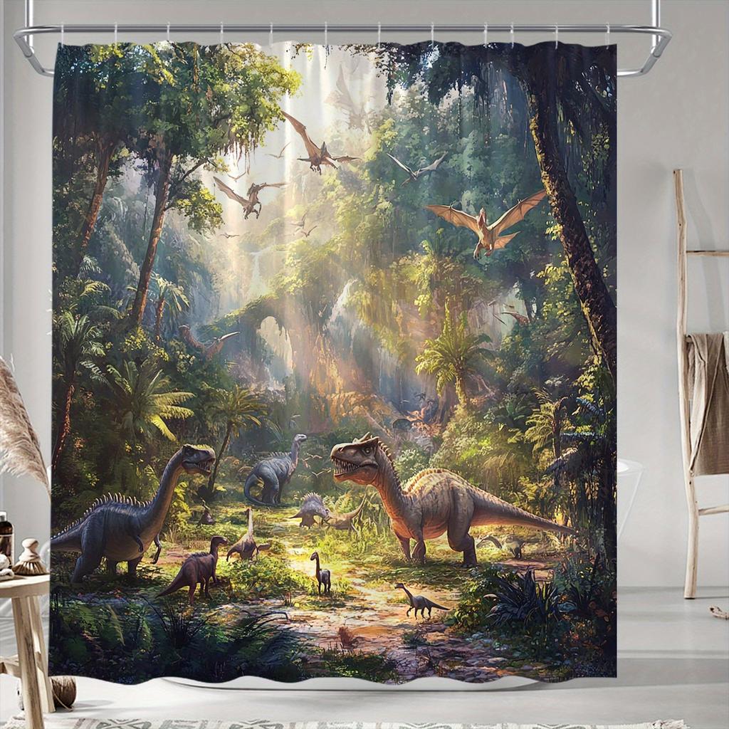 Prehistoric Jungle Dinosaur Shower Curtain - 70.8x70.8In, Polyester, Vivid Lush Landscape with Pterosaurs, Fashion Bath Deco
