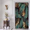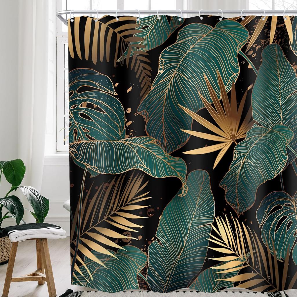 Emerald Green Boho Shower Curtain Black Gold Modern Abstract Palm Leaves Tropical Monstera Bathroom Curtain Set Brown Botanical