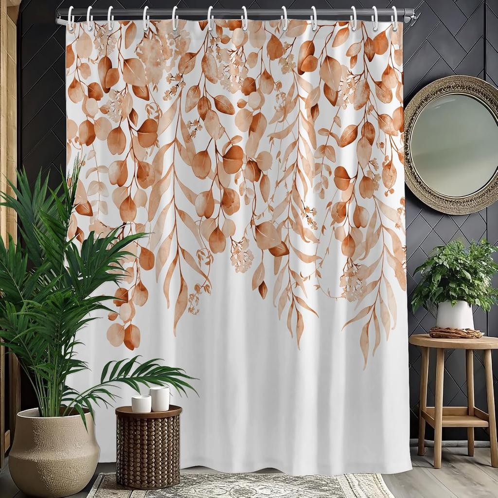 Rustic Brown Leaf Shower Curtain with Hooks, Watercolor Botanical Eucalyptus Bathroom Decor, Boho Farmhouse Waterproof Polyester