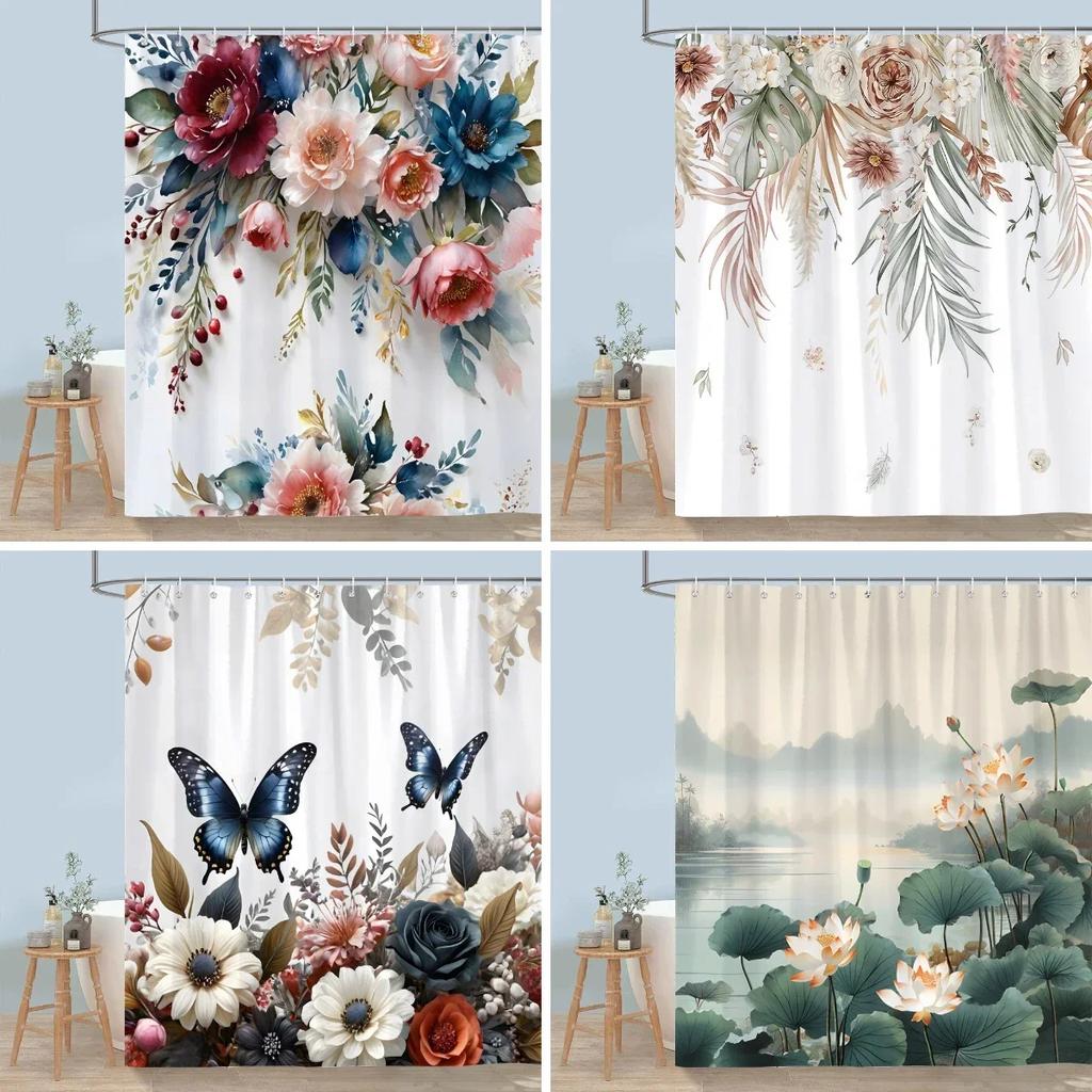 ~O~Pretty Floral Shower Curtain Blooming Flower Butterfly Lotus Polyester Fabric Home Shower Curtains Bathroom Decor With Hooks