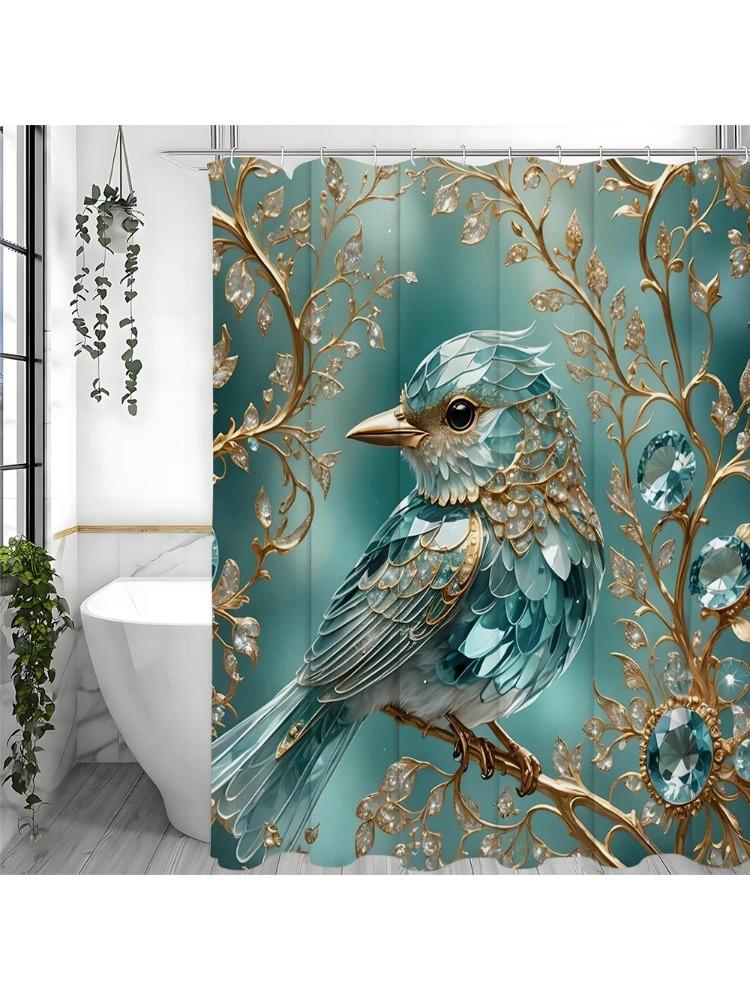 Blue Bird Tree Creative Jewel Shower Curtain, Bathroom Decorative Shower Curtain, Waterproof Shower Curtain with Hooks