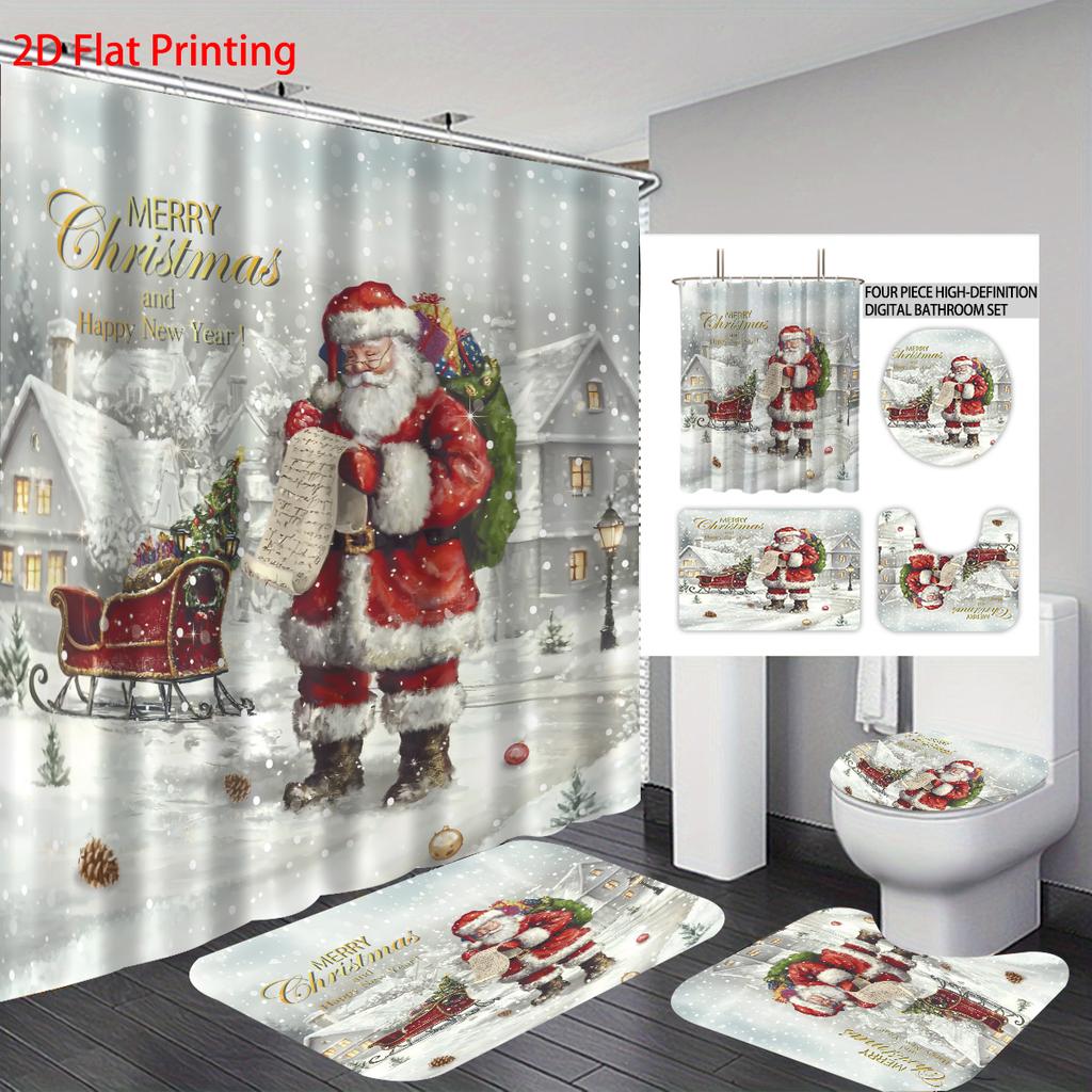 4pcs Merry Christmas Santa Claus Printed Bathroom Set 180x180 Waterproof Shower Curtain Floor Mat Toilet Mat U-shaped Mat