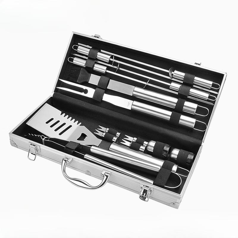 A comprehensive 14-piece stainless steel BBQ tool set by ZISIZ, designed for outdoor grilling. Features large, ergonomic handles for comfortable use and durability, perfect for any BBQ enthusiast.