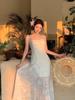 Women's Elegant Green Spaghetti Strap Waist-Cinching Mesh Dress - Summer 2026
