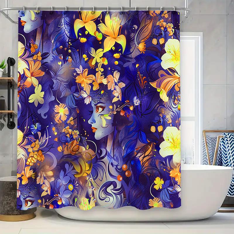 Blue Floral Shower Curtain with Woman's Face Bath Decor for Bathroom 3D Printed Waterproof Custom Size Available (180x240cm)