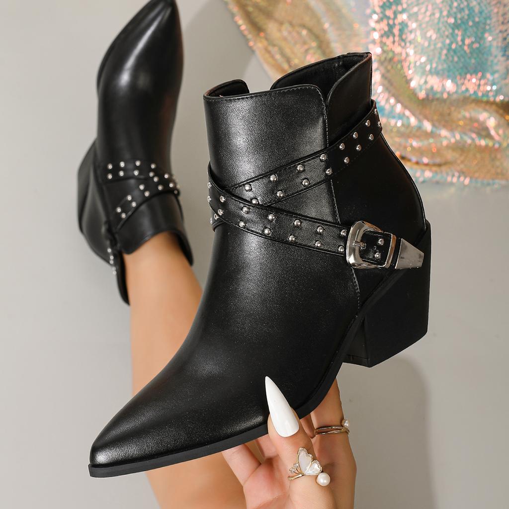Short Boots Women Pointed Thick High-heeled for Autumn Winter 2026 New Rivets, Cross Buckle, Casual Comfortable Women's Boots