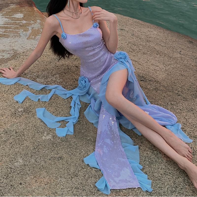 Sexy Split Sequin Suspender Dress Light Luxury High-end Birthday Party Dress Seaside Vacation Dress